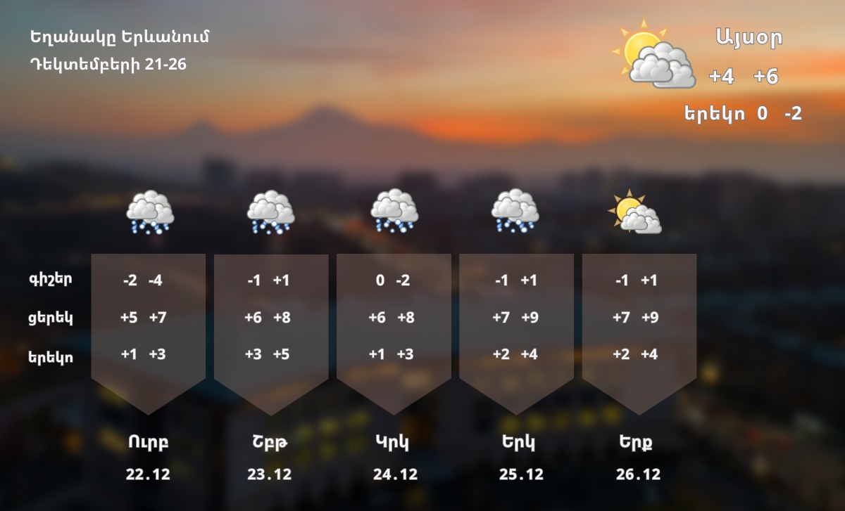 Դեկտեմբերի 22-ին՝ կեսօրից հետո, 23-ին, 24-ին, 25-ի գիշերը սպասվում են տեղումներ, քաղաքի բարձրադիր գոտում՝ թաց ձյուն, հնարավոր է նաև մառախուղ։