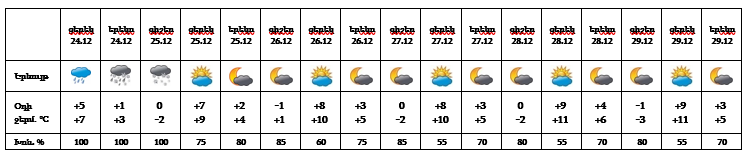 Դեկտեմբերի 25-ի ցերեկը, 26-29-ին սպասվում է առանց տեղումների եղանակ։ Դեկտեմբերի 24-ին սպասվում է քամու ուժգնացում 17-20 մ/վրկ արագությամբ։