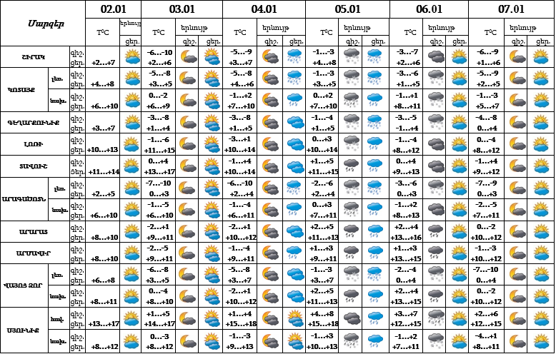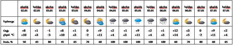 Հունվարի 3-ին, 4-ի գիշերը, 6-ի ցերեկը, 7-ին Հայաստանում սպասվում է առանց տեղումների եղանակ։ Դեկտեմբերի 4-ի ցերեկը և 6-ի գիշերը հանրապետության առանձին շրջաններում, 5-ին շրջանների զգալի մասում սպասվում են տեղումներ և մառախուղ, տեղումները լեռային գոտիներում կլինեն թաց ձյան տեսքով։