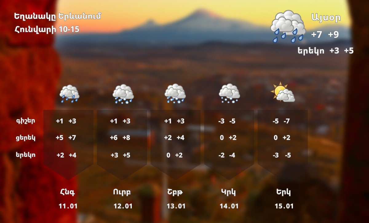 Հունվարի 11-ի ցերեկը, հունվարի 12-ին, 13-ին հանրապետության առանձին շրջաններում, 14-ին շրջանների զգալի մասում սպասվում են տեղումներ և մառախուղ, տեղումները լեռնային գոտիներում կլինեն ձյան, հովտային և նախալեռնային շրջաններում՝ անձրևի և ձնախառն անձրևի տեսքով։