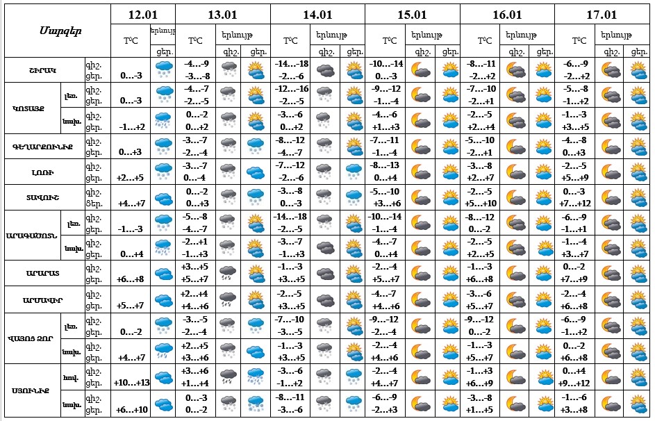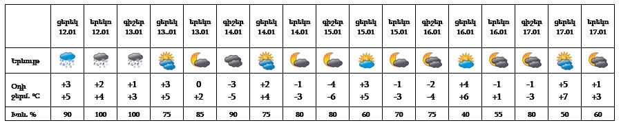 Օդի ջերմաստիճանը հունվարի 13-ի ցերեկը կնվազի 3-5, հունվարի 14-ի գիշերը ևս 6-8 աստիճանով, հունվարի 15-17-ը նույնքան կբարձրանա։