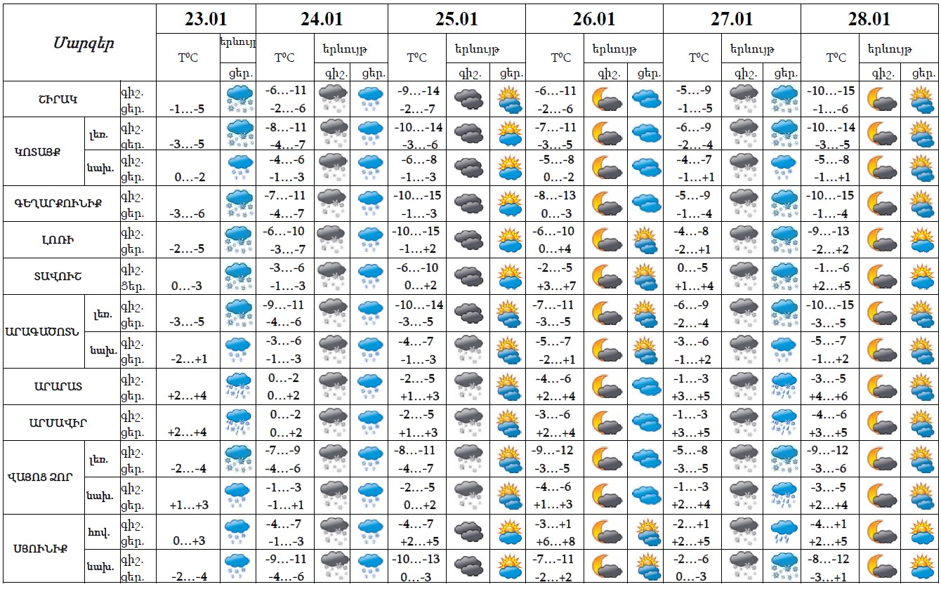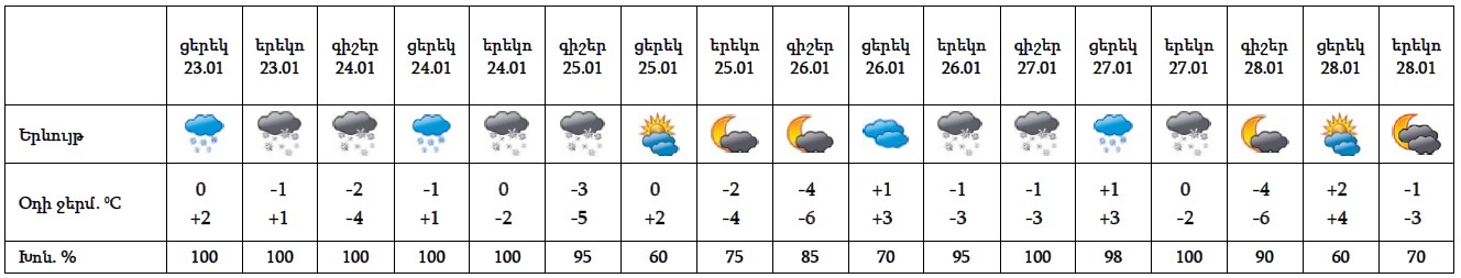 Հանրապետության տարածքում հունվարի 23-ի ցերեկը, 24-ին, 27-ին հանրապետության ամբողջ տարածքում, 26-ի երեկոյան ժամերին առանձին շրջաններում սպասվում է ձյուն։ Հունվարի 23-24-ին տեղումները առանձին հատվածներում կլինեն ինտենսիվ, լեռնային առանձին շրջաններում սպասվում է նաև բուք, մառախուղ, ճանապարհներին՝ մերկասառույց։ Հունվարի 25-ին, 26-ի գիշերը, 28-ին սպասվում է առանց տեղումների եղանակ։
