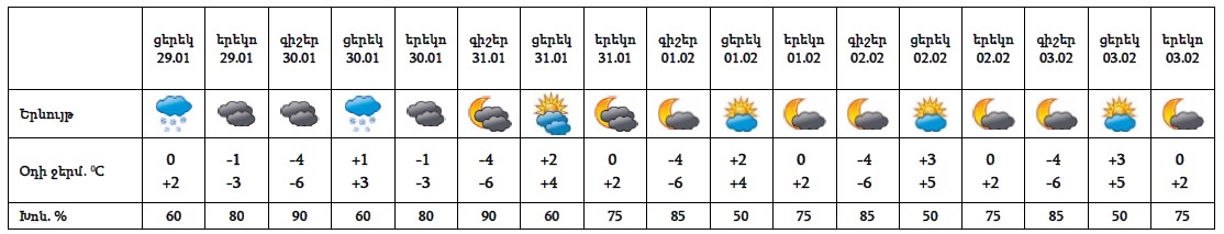 Երևան քաղաքում հունվարի 30-ին հնարավոր է թույլ ձյուն։ Հունվարի 31-ին, փետրվարի 1-3-ին սպասվում է առանց տեղումների եղանակ: