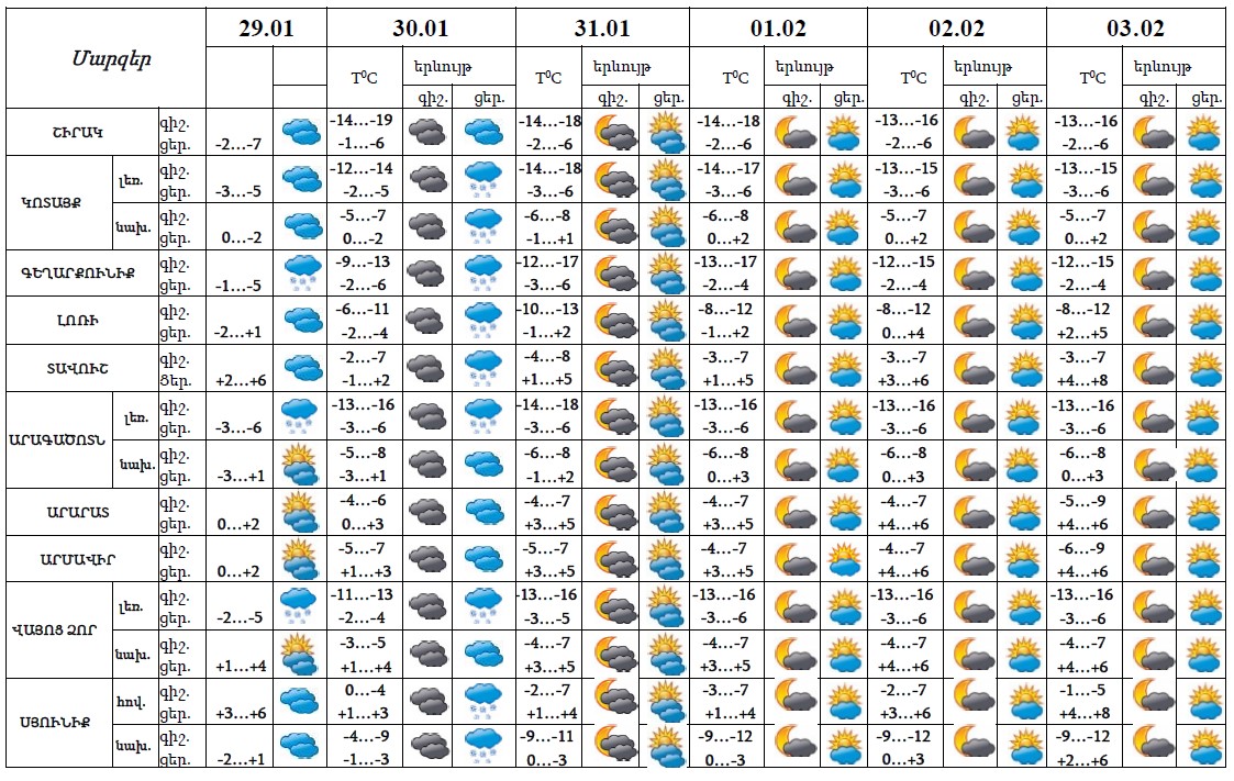 Հանրապետության տարածքում հունվարի 30-ին առանձին շրջաններում սպասվում է թույլ ձյուն, լեռնային առանձին շրջաններում բուք։ Հունվարի 31-ին, փետրվարի 1-3-ին սպասվում է առանց տեղումների եղանակ։