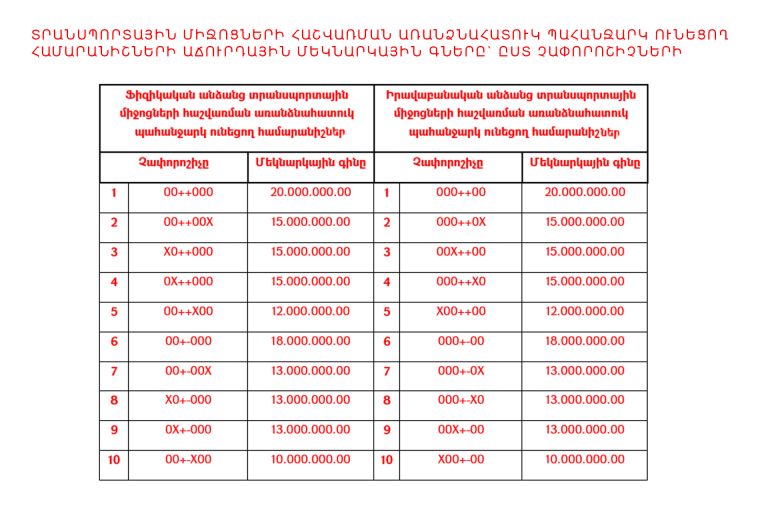 «2024 թ. փետրվարի 1-ից գործարկված էլեկտրոնային աճուրդի հարթակի միջոցով հնարավոր կլինի ձեռք բերել նոր չափորոշիչներով, նոր՝ առանձնահատուկ առանձնահատուկ պահանջարկ ունեցող հաշվառման համարանիշներ։ Նմանօրինակ համարանիշներ ձեռք բերել ցանկացող անձինք աճուրդին ընդառաջ կարող են մասնակցել քվեարկությանը և դրա արդյունքներով ձևավորել այն համարանիշների ցանկը, որոնք քվեարկության արդյունքներով կդրվեն առաջին աճուրդին։ Քվեարկությունը սկսվելու է փետրվարի 2-ից և տևելու է 10 օր։