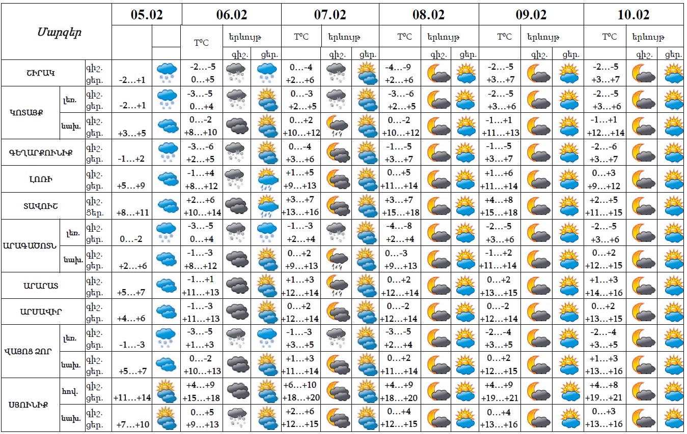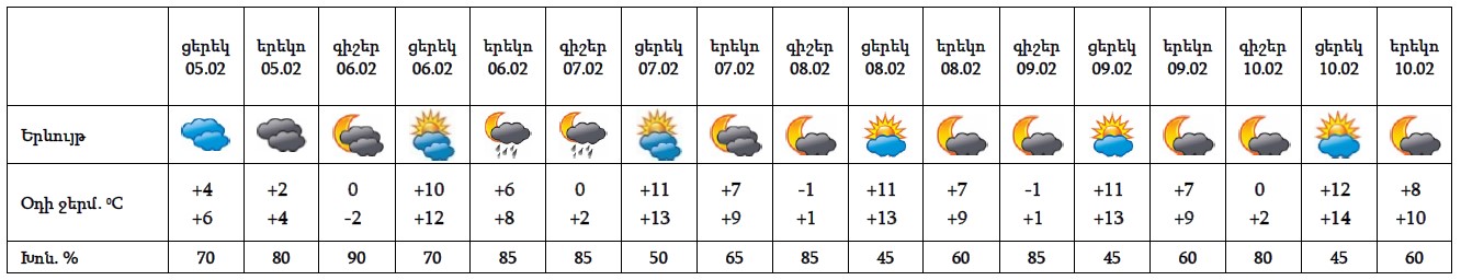 Փետրվարի 5-ի ցերեկը, 6-ին, 7-ի գիշերը հանրապետության առանձին շրջաններում սպասվում են թույլ և կարճատև տեղումներ, լեռնային շրջաններում՝ ձյան տեսքով։ Փետրվարի 7-ի ցերեկը, 8-10-ին սպասվում է առանց տեղումների եղանակ։