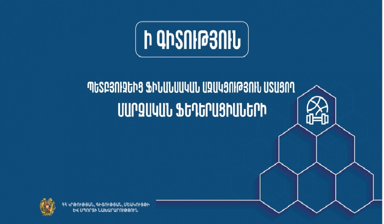 հրամանով նոր խմբագրությամբ է շարադրվել 2017 թ. հուլիսի 24-ի «Հայաստանի Հանրապետության պետական բյուջեից Հայաստանի Հանրապետության մարզաձևերի ֆեդերացիաներին ֆինանսական աջակցության չափի հաշվարկման կարգը, ֆինանսական աջակցության չափը հաշվարկող հանձնաժողովի կազմը և գործունեության կարգը»: