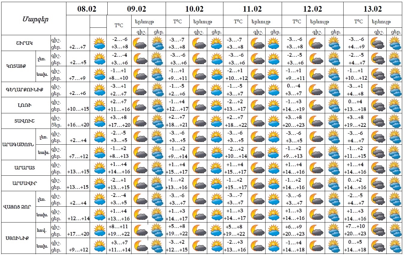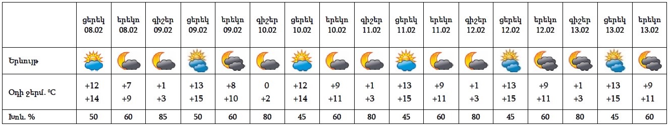 Քամին՝ հարավարևմտյան, 2-5 մ/վ։ Օդի ջերմաստիճանը փետրվարի 9-11-ին աստիճանաբար կբարձրանա ևս 2-4 աստիճանով։