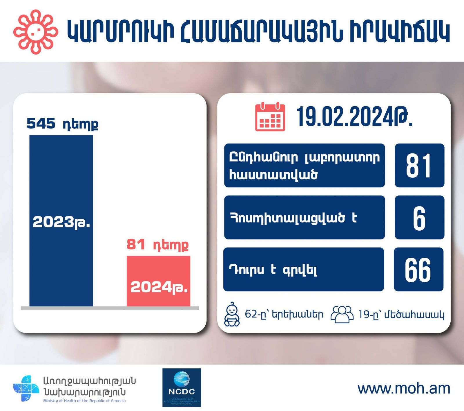 Ըստ այդմ՝ 2023 թ. դրությամբ ընդհանուր լաբորատոր հաստատված դեպքերի թիվը 545 է: 2024-ին հաստատվել է կարմրուկով վարակման 81 դեպք: 6 մարդ հոսպիտալացված է: