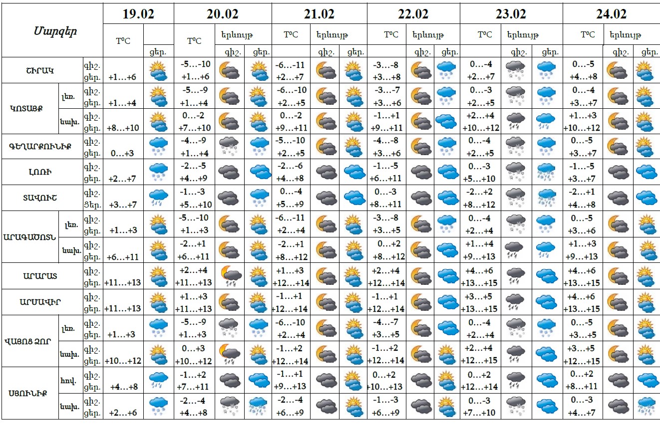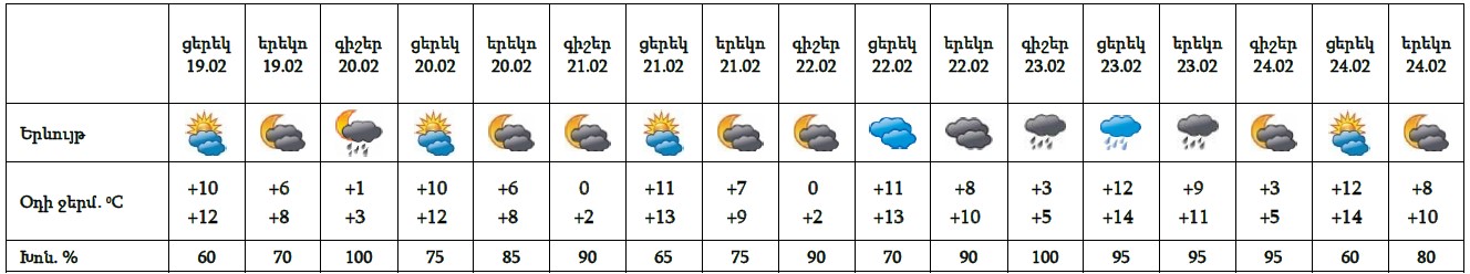 Փետրվարի 19-ի ցերեկը, 20-ին, 22-23-ին առանձին շրջաններում սպասվում են տեղումներ, Լոռիում, Տավուշում, Սյունիքում և լեռնային շրջաններում թաց ձյան տեսքով: Փետրվարի 21-ին և 24-ին սպասվում է առանց տեղումների եղանակ։