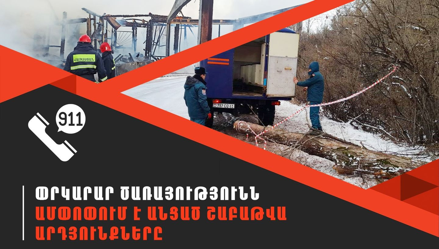 «Մասնավորապես՝ հրդեհի՝ 90, փլուզման, մերկասառույցի` 4-ական, պայթյունի, կենսաապահովման կոմունալ համակարգերում վթարի, դժբախտ պատահարի, անասնահամաճարակի, դիակի հայտնաբերման, քարաթափման՝ 1-ական, ուժեղ քամու, զինամթերքի հայտնաբերման՝ 2-ական, կեղծ ահազանգի՝ 3, թունավորման՝ 5, ինքնասպանության փորձի՝ 9, ճանապարհատրանսպորտային պատահարի՝ 29, ինչպես նաև՝ կենցաղային կանչի՝ 139, հրդեհի ծագման սպառնալիքի՝ 21, հրդեհի կեղծ կանչի՝ 13 և 60 այլ դեպքեր: