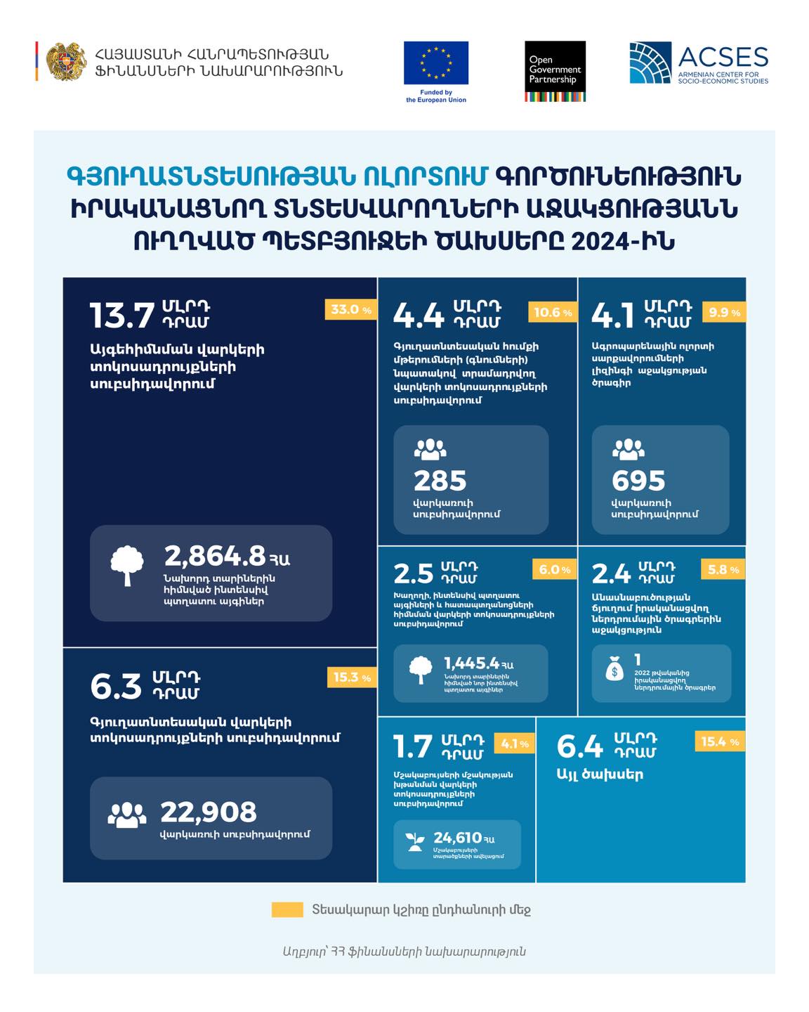 ՀՀ կառավարությունը նախատեսում է 2024 թվականին գյուղատնտեսության ոլորտում գործունեություն իրականացնող տնտեսվարողների աջակցության համար հատկացնել 41 միլիարդ 617 միլիոն դրամ կամ պետական բյուջեի ծախսերի 1.3%-ը։ Այս մասին հայտնում են ՀՀ ֆինանսների նախարարությունից: