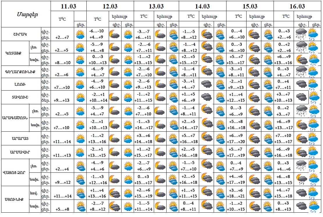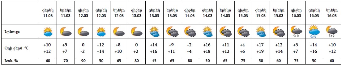 Հանրապետության տարածքում մարտի 11-ի ցերեկը, 12-15-ը սպասվում է առանց տեղումների եղանակ։ Մարտի 16-ին շրջանների զգալի մասում սպասվում են տեղումներ։