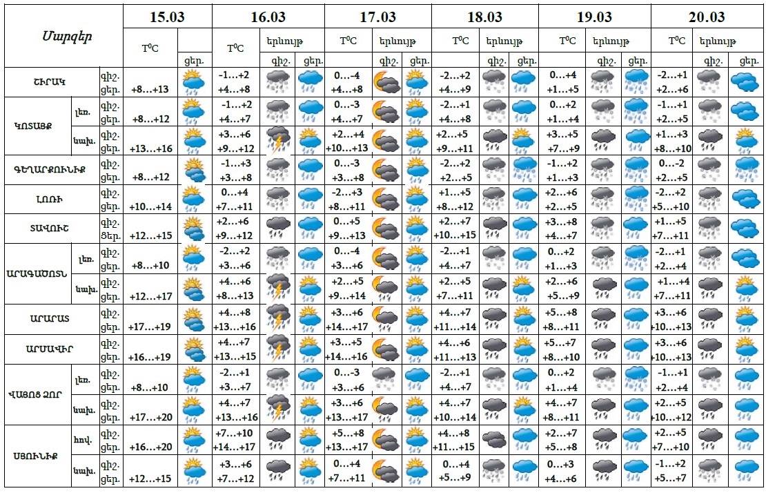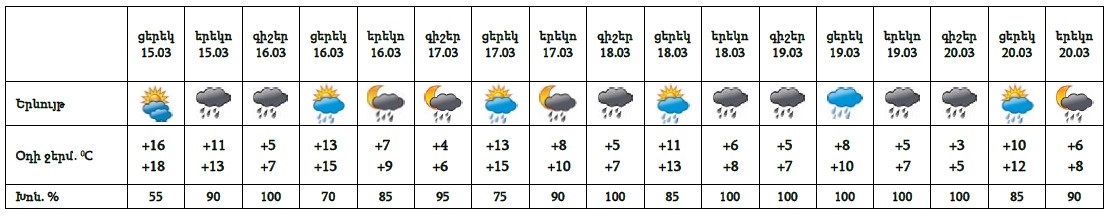 Երևան քաղաքում մարտի 15-ի երեկոյան ժամերին, 16-17-ը ժամանակ առ ժամանակ սպասվում է կարճատև անձրև։ Մարտի 16-ին սպասվում է քամու ուժգնացում 12-15 մ/վ արագությամբ։