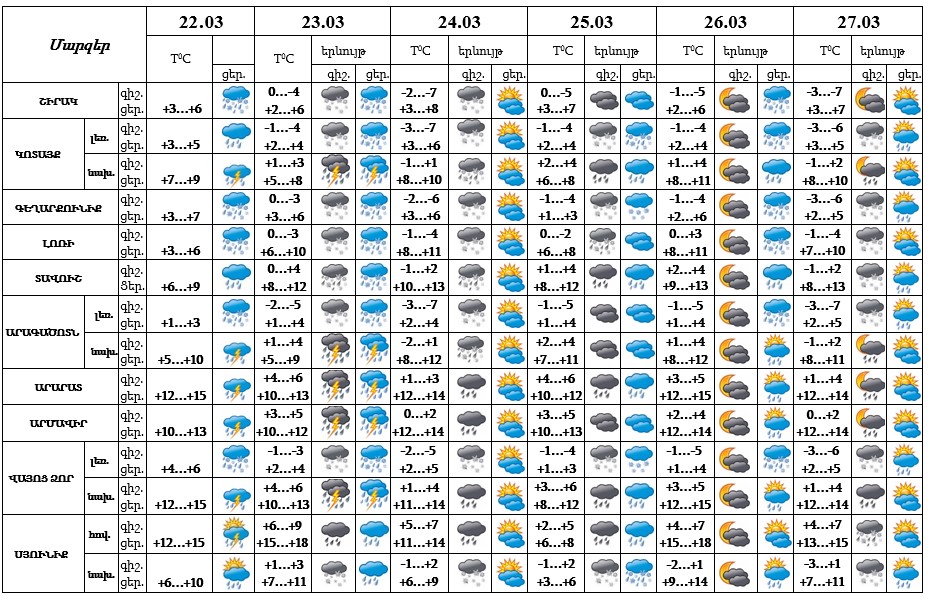 Մարտի 23-ին, 24-ի գիշերը, 25-ին, 26-ի ցերեկը, 27-ի գիշերը շրջանների զգալի մասում, 27-ի ցերեկն առանձին շրջաններում ժամանակ առ ժամանակ սպասվում են տեղումներ և մառախուղ, լեռնային գոտիներում ձյան տեսքով։ Մարտի 23-ին առանձին վայրերում սպասվում է նաև ամպրոպ։ Մարտի 24-ի ցերեկը, 26-ի գիշերը սպասվում է առանց տեղումների եղանակ։