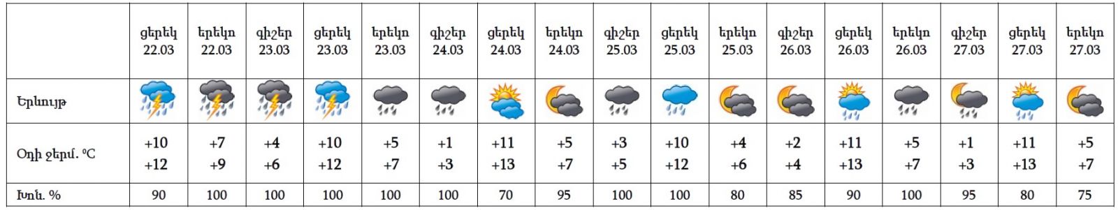 Երևանում մարտի 23-ին, 24-ի գիշերը, 25-ին, 26-ի ցերեկը, 27-ին ժամանակ առ ժամանակ սպասվում է անձրև, հնարավոր է նաև մառախուղ: Մարտի 23-ին հնարավոր է նաև ամպրոպ։ Մարտի 24-ի ցերեկը, 26-ի գիշերը սպասվում է առանց տեղումների եղանակ։