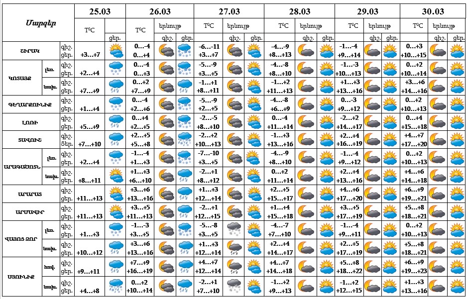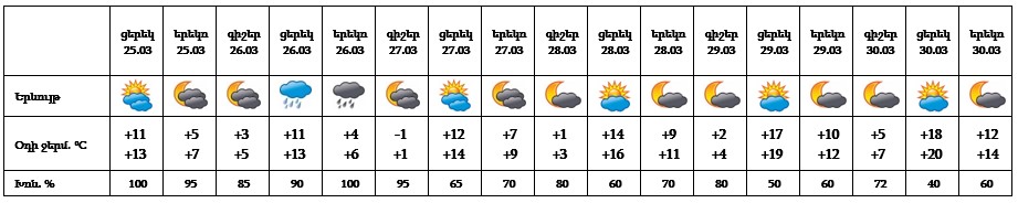 Հանրապետության տարածքում մարտի 25-ի ցերեկը, 26-ին կեսօրից հետո դեպի երեկո շրջանների զգալի մասում, 27-ի գիշերը առանձին շրջաններում ժամանակ առ ժամանակ սպասվում են տեղումներ և մառախուղ լեռնային գոտիներում ձյան տեսքով։ Մարտի 26-ի երեկոյան ժամերին առանձին վայրերում սպասվում է նաև ամպրոպ։ Մարտի 26-ի գիշերը, 27-ի ցերեկը, 28-30-ին սպասվում է առանց տեղումների եղանակ։