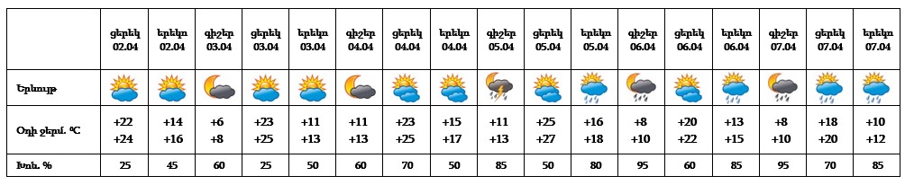 Հանրապետության տարածքում ապրիլի 3-4-ը սպասվում է առանց տեղումների եղանակ։ Ապրիլի 5-7-ին առանձին շրջաններում սպասվում է կարճատև անձրև։