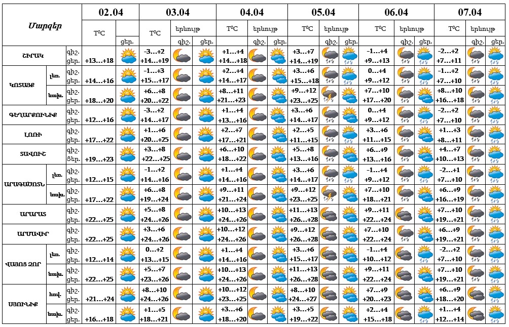 Օդի ջերմաստիճանը ապրիլի 2-5-ին աստիճանաբար կբարձրանա ևս 2-4 աստիճանով, 6-7-ը կնվազի 5-7 աստիճանով։