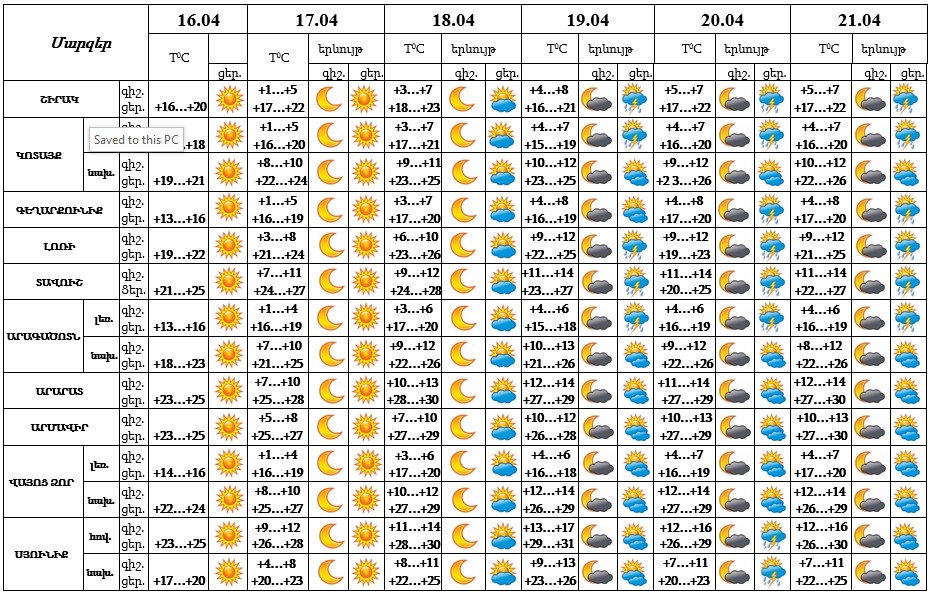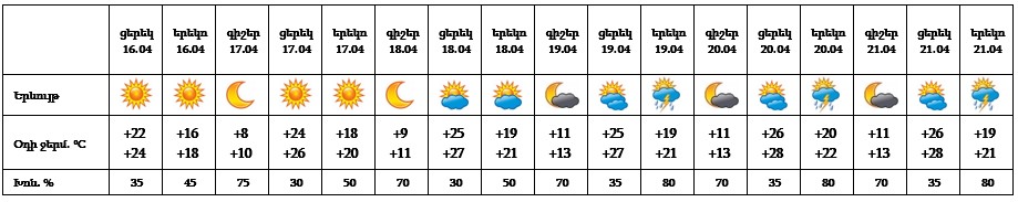 Ապրիլի 16-ի ցերեկը, 17-18-ը սպասվում է առանց տեղումների եղանակ։ Ապրիլի 19-21-ը երեկոյան ժամերին հնարավոր է կարճատև անձրև և ամպրոպ, ամպրոպի ժամանակ՝ քամու ուժգնացում՝ 13-15 մ/վ արագությամբ։