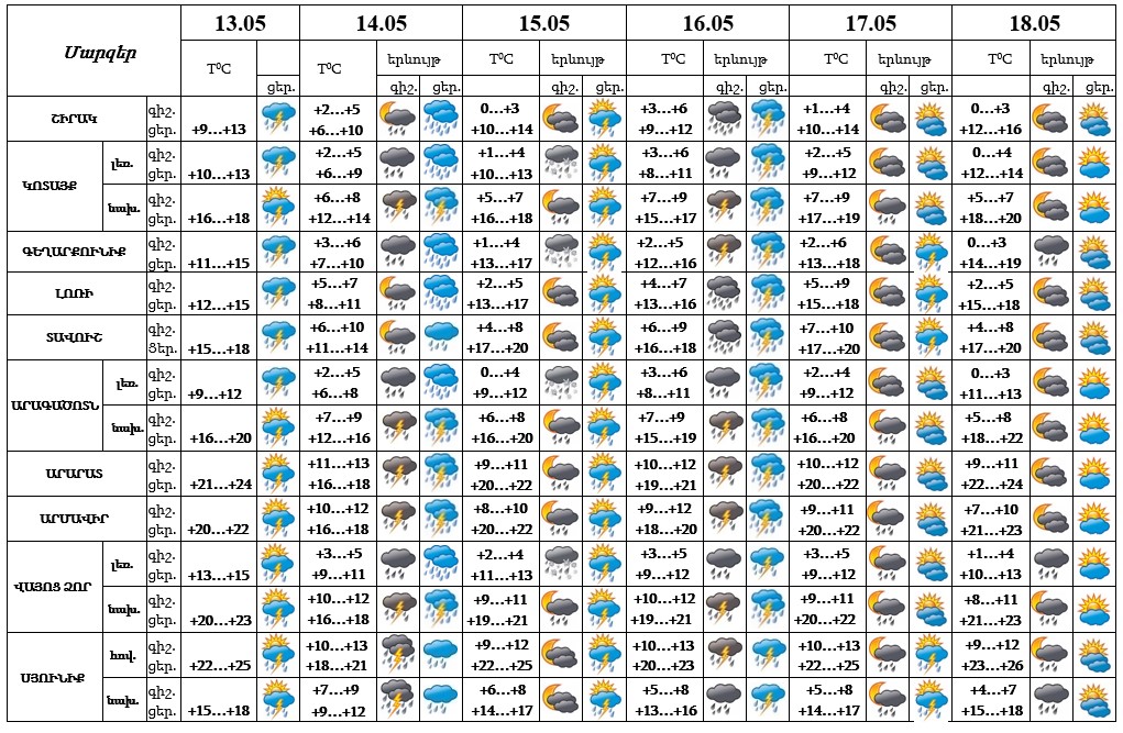 Հանրապետության տարածքում մայիսի 13-ի ցերեկը, 14-16-ը՝ շրջանների զգալի մասում ժամանակ առ ժամանակ, 17-ին, 18-ի գիշերը առանձին շրջաններում սպասվում են անձրև և ամպրոպ, առանձին շրջաններում՝ ինտենսիվ, հնարավոր է նաև կարկուտ։ Մայիսի 18-ի ցերեկը առանձին շրջաններում սպասվում է կարճատև անձրև։