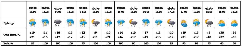 Երևան քաղաքում մայիսի 13-ի ցերեկը, 14-16-ին, 17-ի գիշերը ժամանակ առ ժամանակ սպասվում են, 17-ի երեկոյան ժամերին, 18-ի գիշերը հնարավոր են անձրև և ամպրոպ, քաղաքի առանձին հատվածներում՝ ինտենսիվ, հնարավոր է նաև կարկուտ, ամպրոպի ժամանակ՝ քամու ուժգնացում 16-20 մ/վ արագությամբ։ Մայիսի 18-ի ցերեկը սպասվում է առանց տեղումների եղանակ։