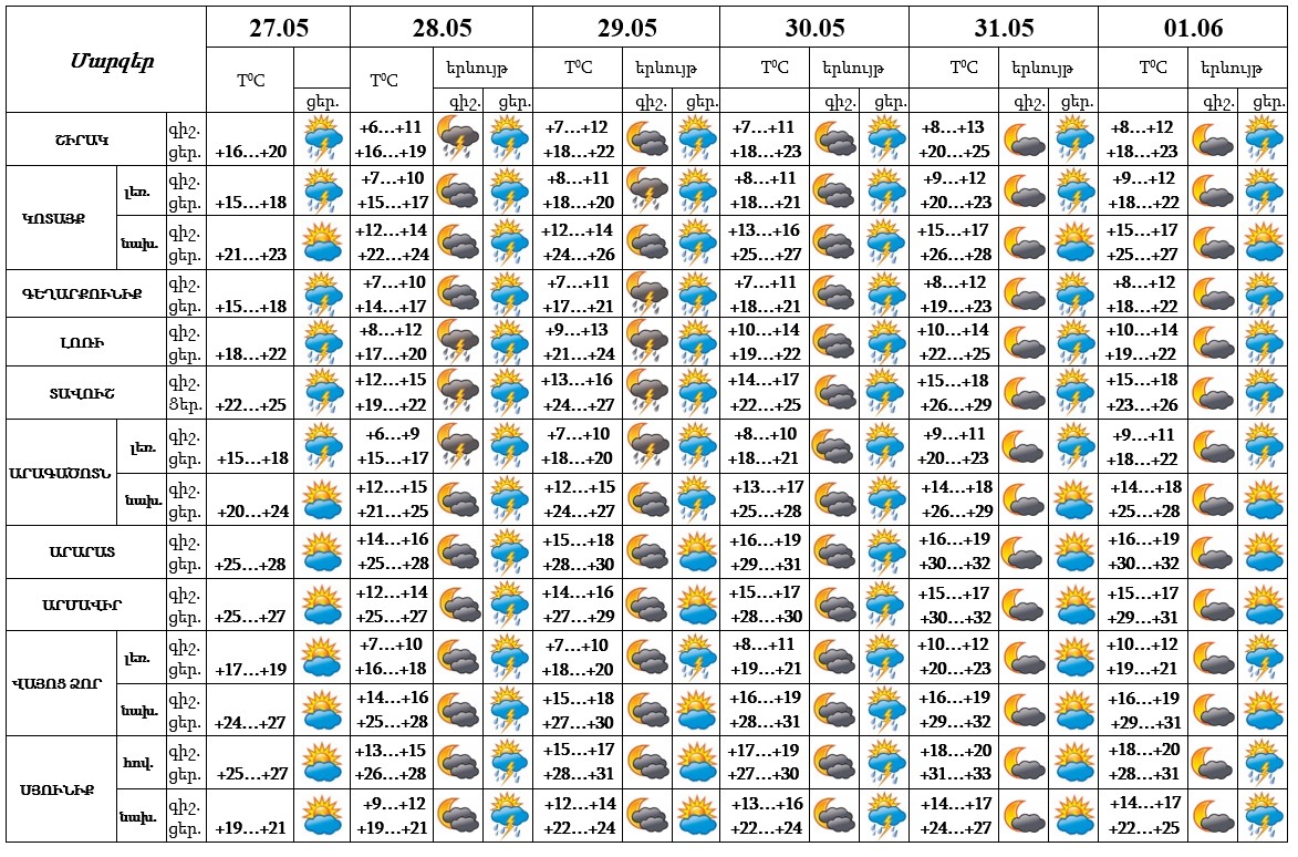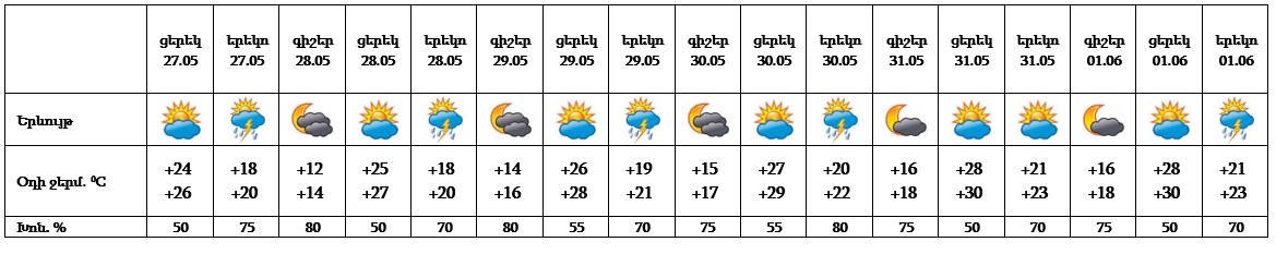Մայիսի 27-ի ցերեկը, 29-ին, 31-ին, հունիսի 1-ին հանրապետության առանձին շրջաններում, 28-ին և 30-ին շրջանների մեծ մասում սպասվում է կարճատև անձրև են ամպրոպ, առանձին հատվածներում հնարավոր է կարկուտ։