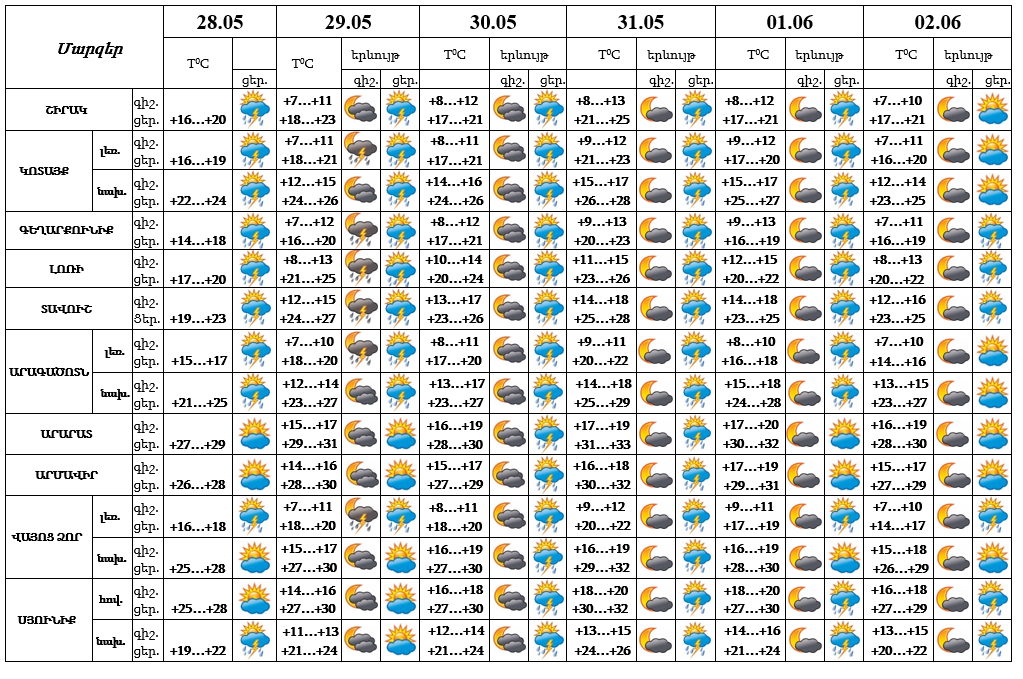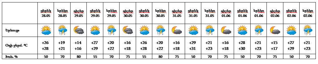 Հանրապետության տարածքում մայիսի 28-ի և 30-31-ի ցերեկը շրջանների մեծ մասում, 29-ին, հունիսի 1-2-ը՝ առանձին շրջաններում սպասվում է կարճատև անձրև և ամպրոպ, առանձին հատվածներում հնարավոր է կարկուտ։ Քամին՝ հարավարևմտյան, 3-5 մ/վ, ամպրոպի ժամանակ սպասվում է քամու ուժգնացում՝ 18-23 մ/վ արագությամբ: