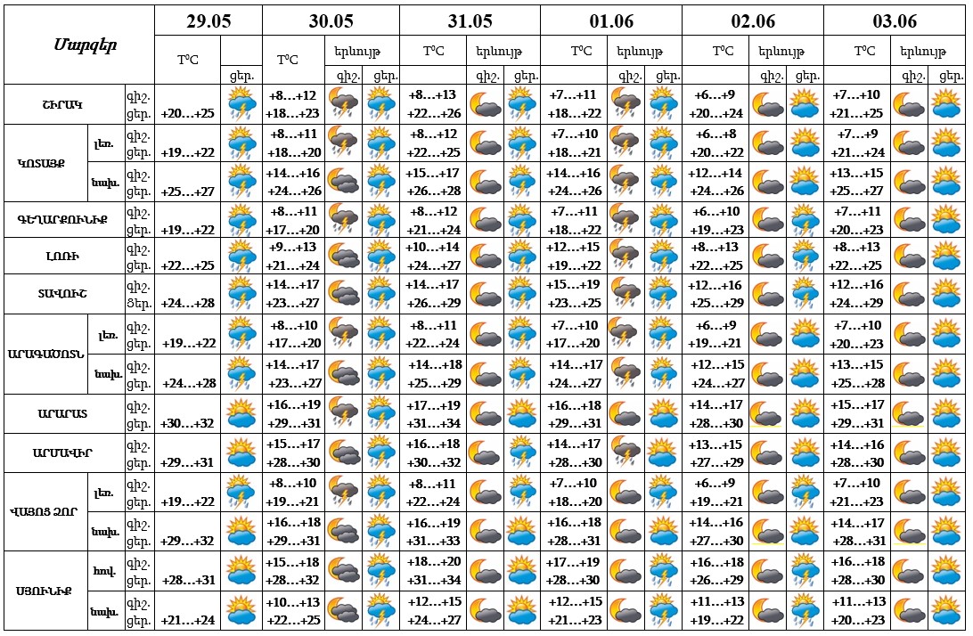 Մայիսի 30-ին գիշերը և կեսօրից հետո, 31-ին կեսօրից հետո, հունիսի 1-ին շրջանների մեծ մասում, հունիսի 2-ին առանձին շրջաններում սպասվում են կարճատև անձրև և ամպրոպ, առանձին հատվածներում հնարավոր է կարկուտ։ Հունիսի 3-ին սպասվում է առանց տեղումների եղանակ։