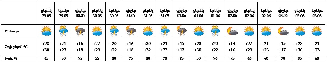 Երևանում մայիսի 30-ին, 31-ին երեկոյան ժամերին, հունիսի 1-ին գիշերը և երեկոյան ժ ամերին սպասվում է կարճատև անձրև և ամպրոպ, ամպրոպի ժամանակ՝ քամու ուժգնացում՝ 16-20մ/վ արագությամբ։ Հունիսի 2-3-ը սպասվում է առանց տեղումների եղանակ։