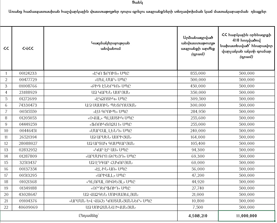 22 դեպքով արձանագրվել են առանց համապատասխան հաշվարկային փաստաթղթեր դուրս գրելու` ընդհանուր 4,508,210 ՀՀ դրամի ՀՀ հարկային օրենսգրքի պահանջների խախտումով ապրանքների տեղափոխման կամ մատակարարման դեպքեր: Հնարավոր տուգանքի գումարը կազմում է 11,000,000 ՀՀ դրամ։