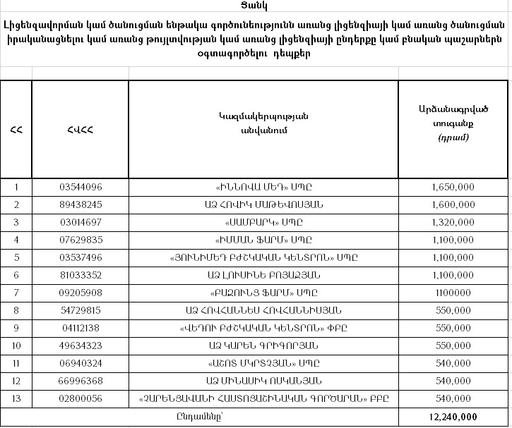 13 դեպքով արձանագրվել են լիցենզավորման կամ ծանուցման ենթակա գործունեությունն առանց լիցենզիայի կամ առանց ծանուցման իրականացնելու, կամ առանց թույլտվության, կամ առանց լիցենզիայի ընդերքը կամ բնական պաշարներն օգտագործելու խախտումներ։ Արձանագրված խախտումների գումարը կազմում է 12,240,000 ՀՀ դրամ։