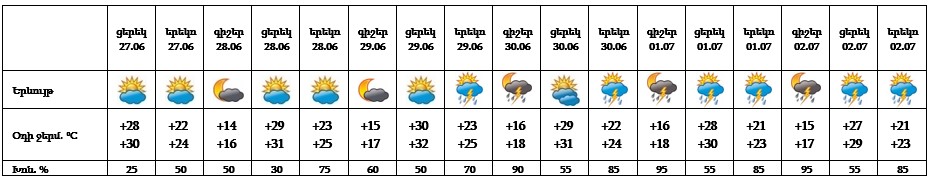 Երևան քաղաքում հունիսի 27-ի ցերեկը, 28-ին, 29-ի գիշերը սպասվում է առանց տեղումների եղանակ։ Հունիսի 29-ի երեկոյան ժամերին, 30-ին, հուլիսի 1-2-ը սպասվում է կարճատև անձրև և ամպրոպ, սպասվում է նաև քամու ուժգնացում ամպրոպի ժամանակ՝ 16-20 մ/վ, երեկոյան ժամերին՝ 14-17 մ/վ արագությամբ։