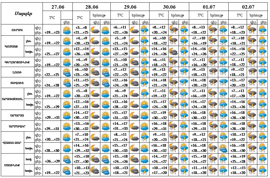 Հանրապետության տարածքում հունիսի 27-ի ցերեկը, 28-ին, 29-ի գիշերը սպասվում է առանց տեղումների եղանակ։ Հունիսի 29-ին կեսօրից հետո առանձին շրջաններում, 30-ին, հուլիսի 1-2-ին շրջանների զգալի մասում սպասվում է անձրև և ամպրոպ, առանձին հատվածներում՝ նաև կարկուտ։