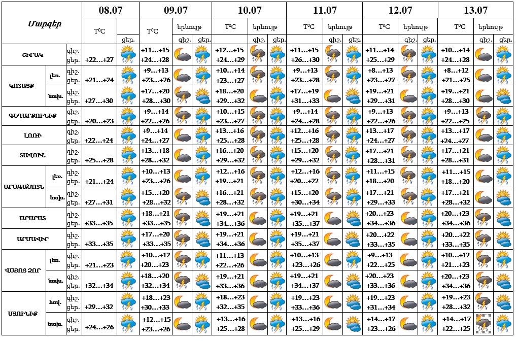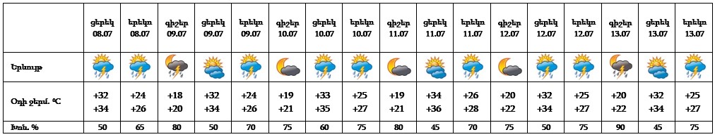 Երևան քաղաքում hուլիսի 8-ի ցերեկը, 9-13-ի գիշերը և կեսօրից հետո սպասվում է կարճատև անձրև և ամպրոպ։ Ամպրոպի ժամանակ սպասվում է քամու ուժգնացում` 18-23 մ/վ արագությամբ։