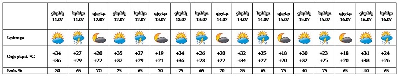 Հուլիսի 11-ի երեկոյան, 12-16-ի գիշերը և երեկոյան քաղաքի առանձին հատվածներում հնարավոր է կարճատև անձրև և ամպրոպ։ Ամպրոպի ժամանակ սպասվում է քամու ուժգնացում՝ 18-23 մ/վ արագությամբ։