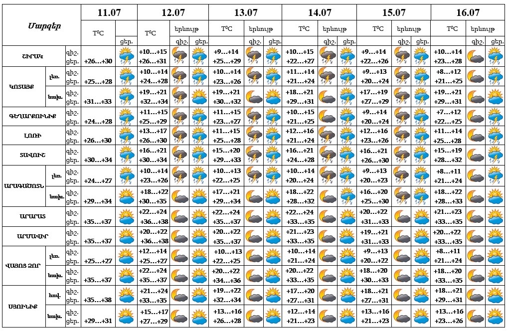 Հուլիսի 11-ին՝ կեսօրից հետո, 12-16-ը առանձին շրջաններում սպասվում է կարճատև անձրև և ամպրոպ, առանձին հատվածներում՝ հորդառատ, հնարավոր է կարկուտ: