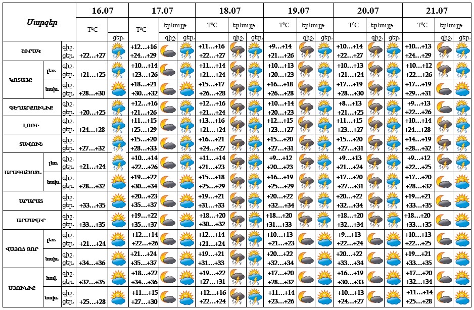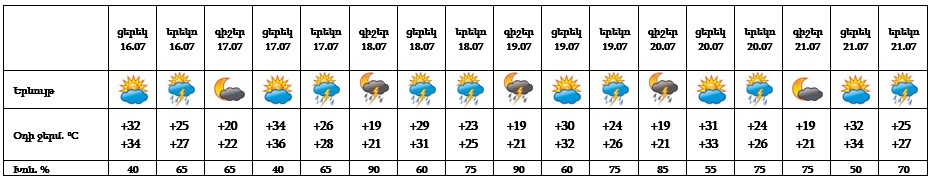Երևան քաղաքում հուլիսի 16-ին երեկոյան, 17-ին, 21-ին գիշերը և երեկոյան քաղաքի առանձին հատվածներում հնարավոր է կարճատև անձրև և ամպրոպ: Հուլիսի 18-20-ը սպասվում է կարճատև անձրև և ամպրոպ։ Ամպրոպի ժամանակ և երեկոյան սպասվում է քամու ուժգնացում՝18-23 մ/վ արագությամբ։