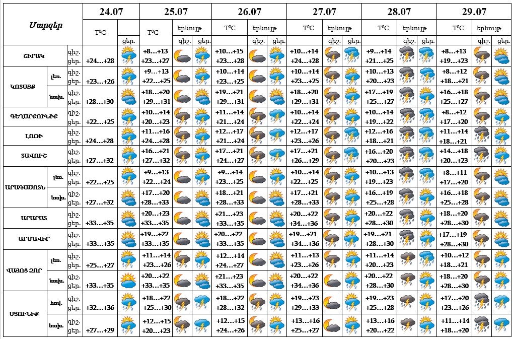 Հուլիսի 24-ի և 29-ի ցերեկը, 25-26-ին գիշերը և կեսօրից հետո, հանրապետության առանձին շրջաններում սպասվում են կարճատև անձրև և ամպրոպ։ Հուլիսի 27-28-ը, 29-ի գիշերը, ժամանակ առ ժամանակ, շրջանների զգալի մասում սպասվում են անձրև և ամպրոպ, առանձին հատվածներում՝ հորդառատ, հնարավոր է նաև կարկուտ։