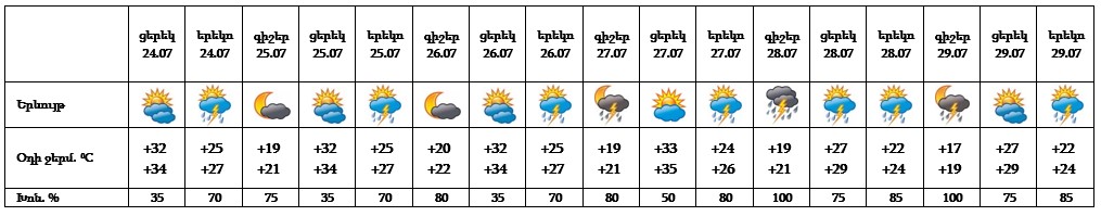 Երևանում հուլիսի 24-26-ը, 29-ին երեկոյան ժամերին քաղաքի առանձին հատվածներում հնարավոր են կարճատև անձրև և ամպրոպ։ Հուլիսի 27-28-ը, 29-ի գիշերը, ժամանակ առ ժամանակ, սպասվում են անձրև և ամպրոպ, քաղաքի առանձին հատվածներում՝ հորդառատ։ Սպասվում է նաև քամու ուժգնացում՝ ամպրոպի ժամանակ՝ 20-25 մ/վ, երեկոյան ժամերին՝ 17-20 մ/վ արագությամբ։