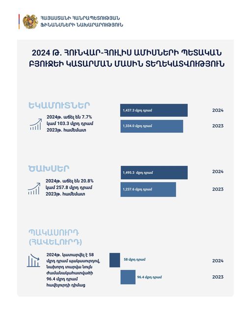 2024 թվականի հունվար-հուլիս ամիսների ընթացքում ՀՀ պետական բյուջեն կատարվել է 58 մլրդ դրամ պակասուրդով՝ նախորդ տարվա նույն ժամանակահատվածի 96,4 մլրդ դրամ հավելուրդի դիմաց: