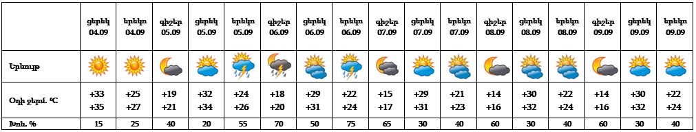 Սեպտեմբերի 4-ի և 5-ի երեկոյան ժամերին, 6-ին, 7-ի գիշերը հանրապետության առանձին շրջաններում սպասվում է կարճատև անձրև և ամպրոպ։ Սեպտեմբերի 7-ի ցերեկը, 8-9-ին սպասվում է առանց տեղումների եղանակ։