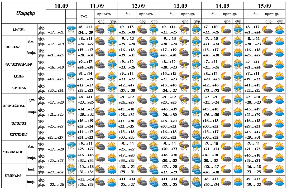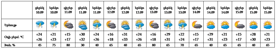 Երևանում՝ սեպտեմբերի 10-ի և 13-ի ցերեկը սպասվում է, 11-12-ին երեկոյան ժամերին հնարավոր է կարճատև անձրև և ամպրոպ։ Ամպրոպի ժամանակ սպասվում է քամու ուժգնացում՝ 16-18 մ/վ արագությամբ։ Սեպտեմբերի 14-15-ին սպասվում է առանց տեղումների եղանակ։