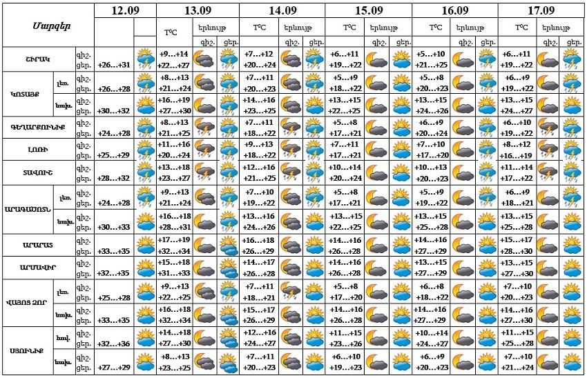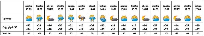 Սեպտեմբերի 12-ին,16-ի կեսօրից հետո,13-14-ը և 17-ին ժամանակ առ ժամանակ հանրապետության առանձին շրջաններում սպասվում են կարճատև անձրև և ամպրոպ։ Սեպտեմբերի 15-ին սպասվում է առանց տեղումների եղանակ։