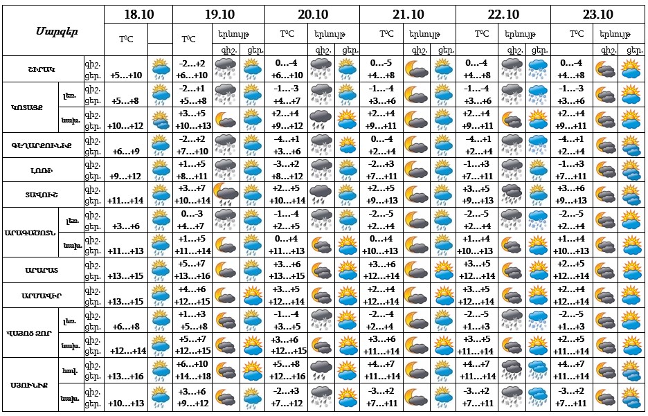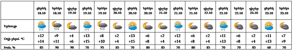 Հոկտեմբերի 18-ի ցերեկը հանրապետության շրջանների զգալի մասում, 19-22-ը առանձին շրջաններում սպասվում են կարճատև տեղումներ, լեռնային գոտիներում ձյան տեսքով: Հոկտեմբերի 23-ին սպասվում է առանց տեղումների եղանակ։
