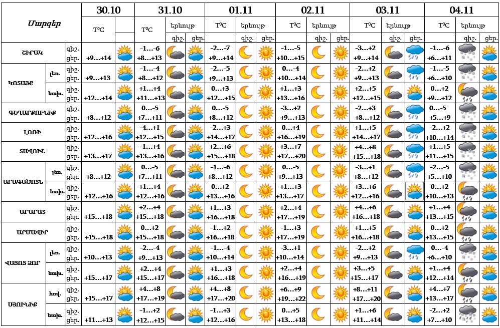 Մարզերում հոկտեմբերի 30-ի ցերեկը, 31-ին, նոյեմբերի 1-2-ը սպասվում է առանց տեղումների եղանակ։