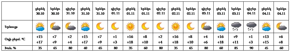 Օդի ջերմաստիճանը հոկտեմբերի 31-ի գիշերն աստիճանաբար կբարձրանա ևս 1-2 աստիճանով։