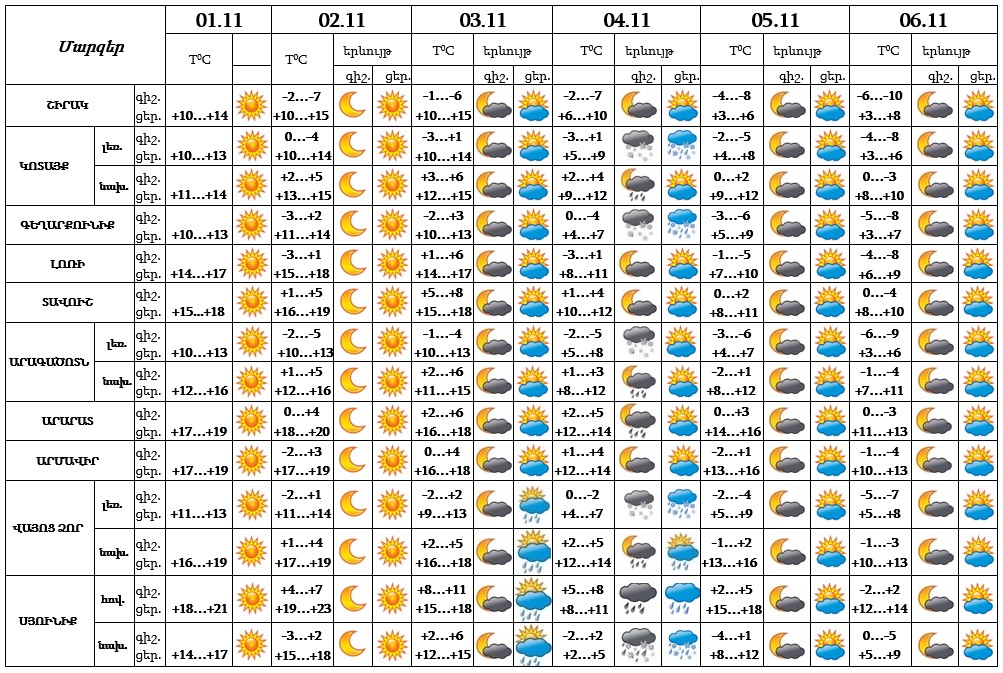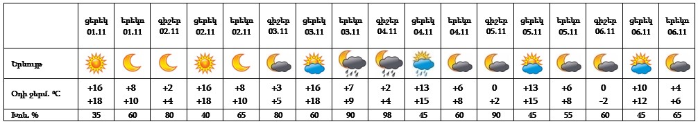 Նոյեմբերի 1-ի ցերեկը, 2-ին, 3-ի գիշերը, 5-6-ին սպասվում է առանց տեղումների եղանակ։ Նոյեմբերի 3-ի ցերեկը, 4-ին հանրապետության առանձին շրջաններում սպասվում են տեղումներ, լեռնային գոտիներում ձյան տեսքով։