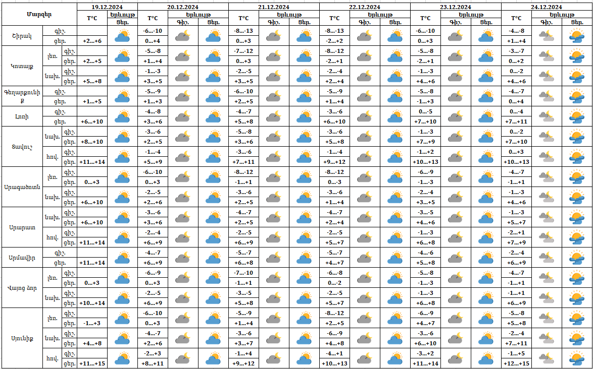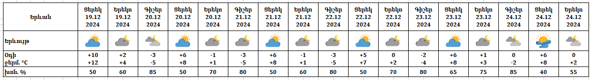 Դեկտեմբերի 19-ի ցերեկը, 20-24-ին սպասվում է առանց տեղումների եղանակ։ Քամին՝ արևմտյան, 3-6 մ/վ, դեկտեմբերի 19-ի ցերեկը սպասվում է քամու ուժգնացում՝ 15-18 մ/վ արագությամբ։
