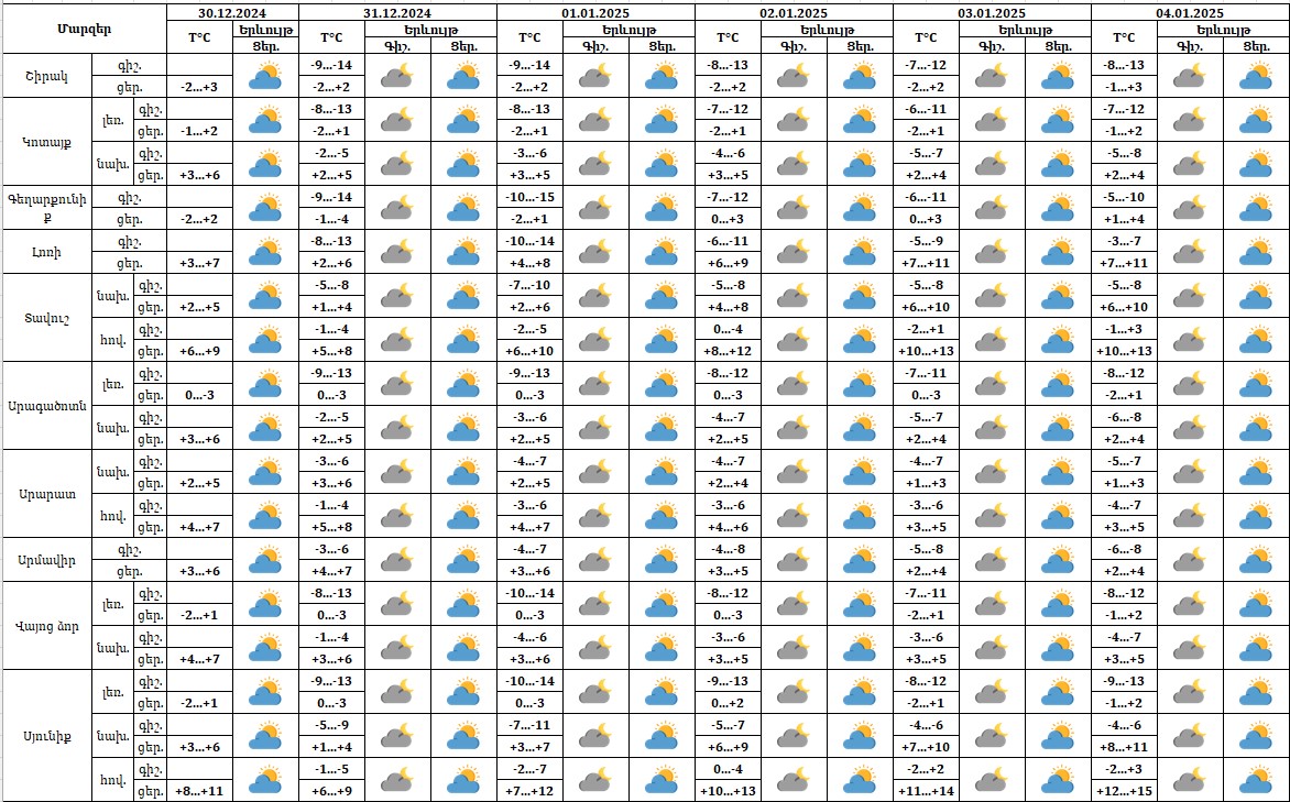 Հանրապետության տարածքում դեկտեմբերի 30-ի ցերեկը, 31-ին, հունվարի 1-4-ը սպասվում է առանց տեղումների եղանակ։ Արարատյան դաշտում առավոտյան ժամերին սպասվում է մառախուղ, ճանապարհներին՝ մերկասառույց։ Քամին արևմտյան 2-4մ/վ։ Օդի ջերմաստիճանն էապես չի փոխվի։